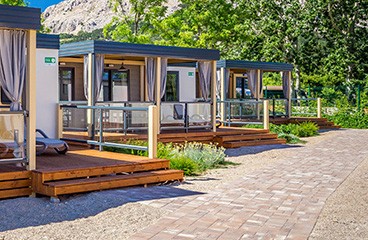 Izberite moderno dizajnirani premium camping home v naselju Vela Bay Village in se sprostite, kot še nikoli doslej. Z lokacijo v mirnem delu Valamar Campinga Baška vam bo Vela Bay Village zagotovil dovolj zasebnosti in sredozemski šarm, ki ste ga iskali.